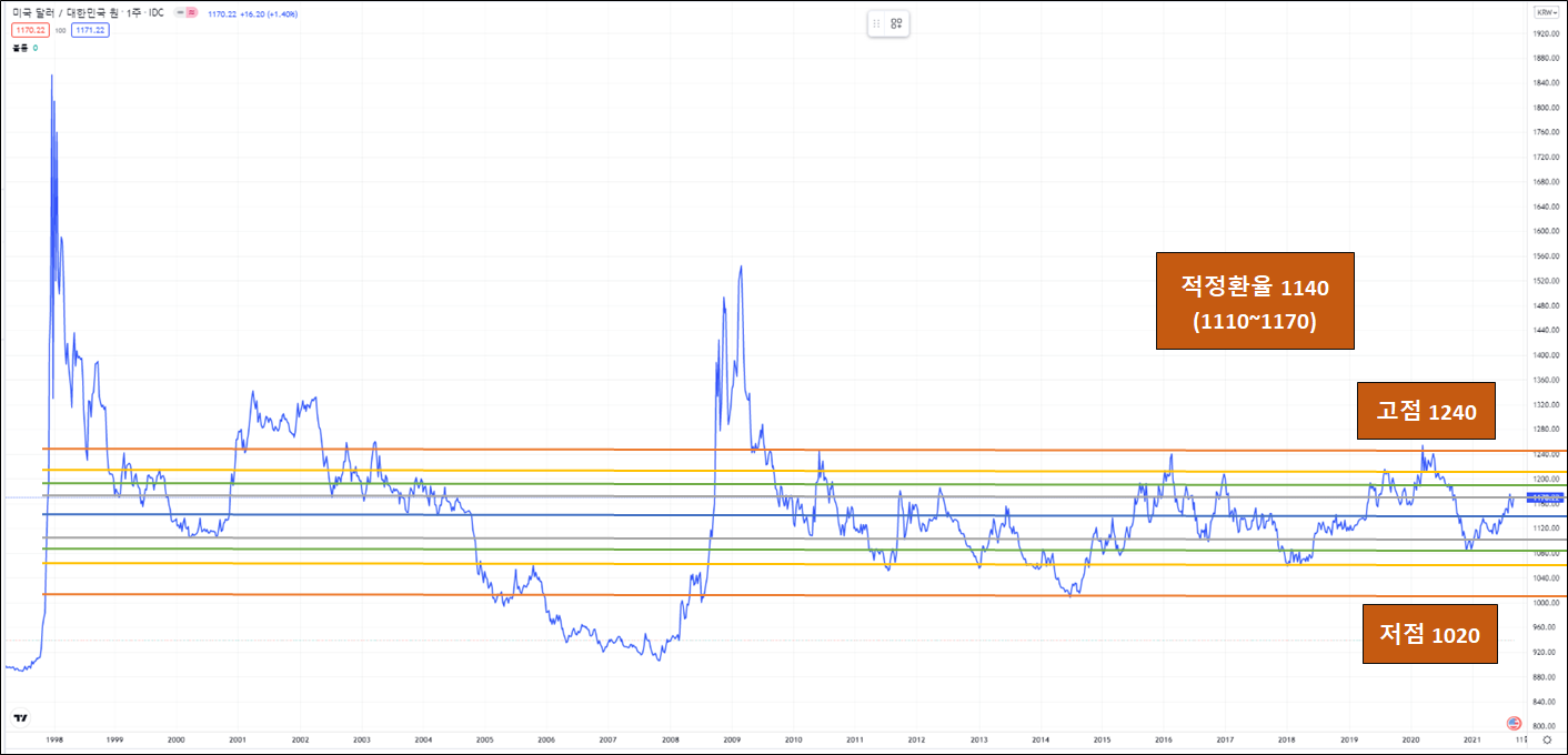 '97년 IMF 금융위기, '08년 서브프라임사태에 1500원을 돌파한 이후로는 1020~1240원 사이를 왔다갔다 하는 중이다.